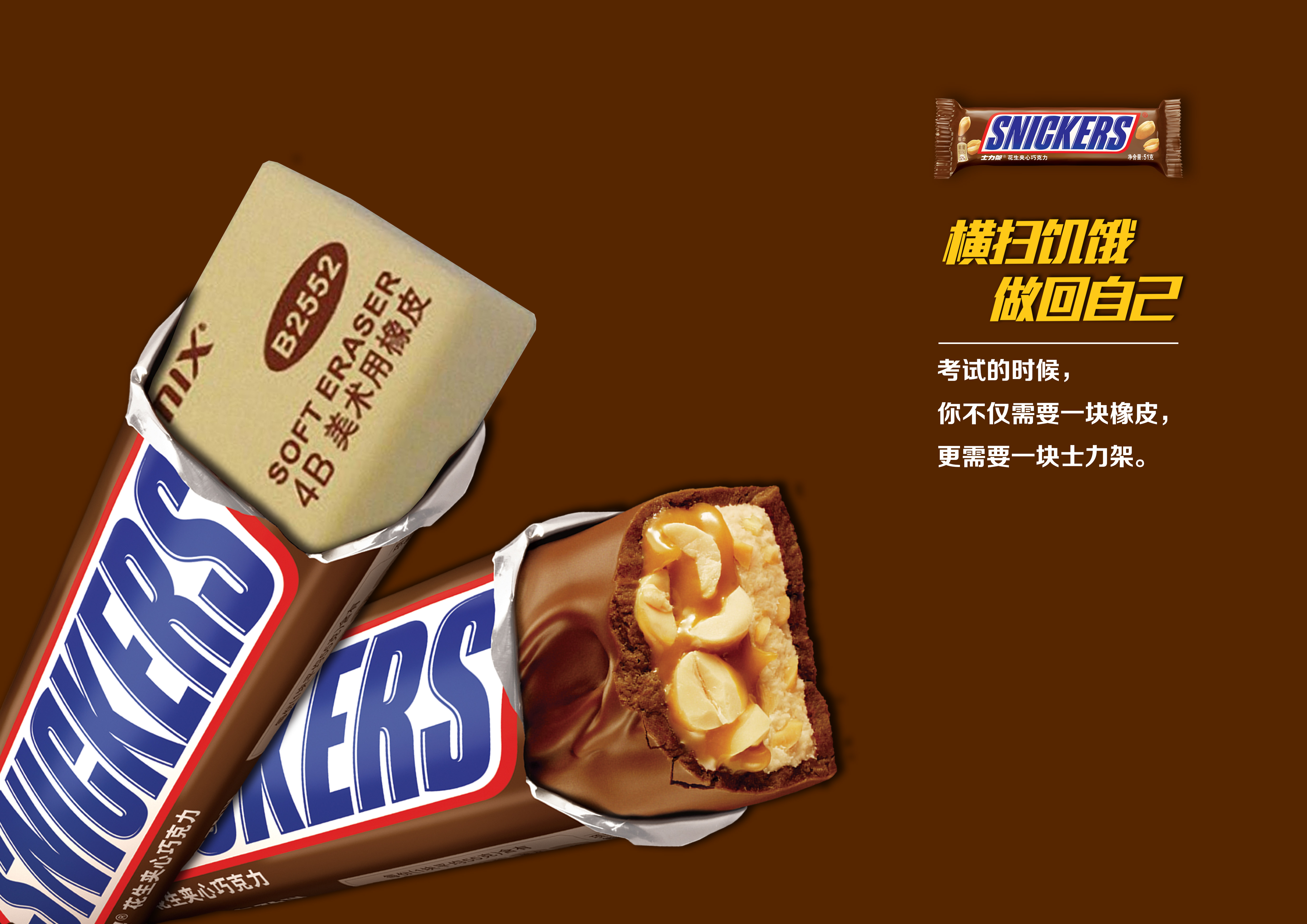 把撕开的士力架和考试中常用的橡皮结合起来,向消费者传达在考试中不仅橡皮不可代替士力架也是非常需要的,橡皮可以擦掉写错的地方,同时士力架可以让我们横扫饥饿、做回自己。