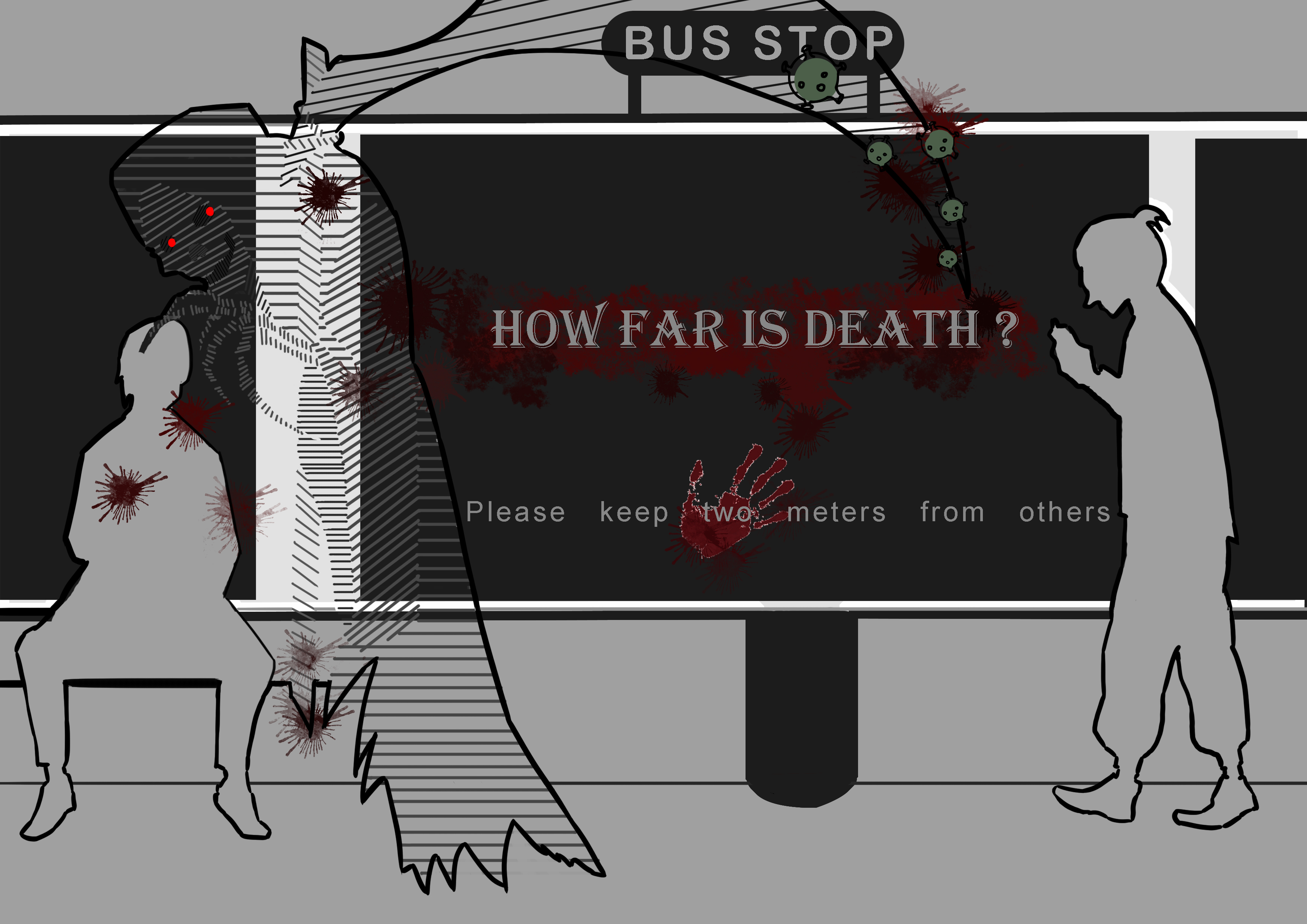 Maintain social distance is we want to convey the main concepts, we will be the number two meters into the concept of death's Long knife. The man on the left of the bus stop is infected with a virus. Death finds him, the person targeted by Death is a dead person, and his long sword can indirect damage trying to close to. So want to ensure the safety of their own, be sure to guarantee two meters distance between people, don't take the initiative to close to every one of us. 保持社交距离是我们想要传达的主要概念,我们将两米这个数字融入到死神的长刀这个概念当中。公交站牌左边的人感染了病毒,死神找到了他,而被死神盯上的人意味着死亡,他的长刀也可以间接性的伤害试图靠近的人。所以想要保证自己的安全,务必要保证人与人之间的两米距离,不主动接近每一个人。