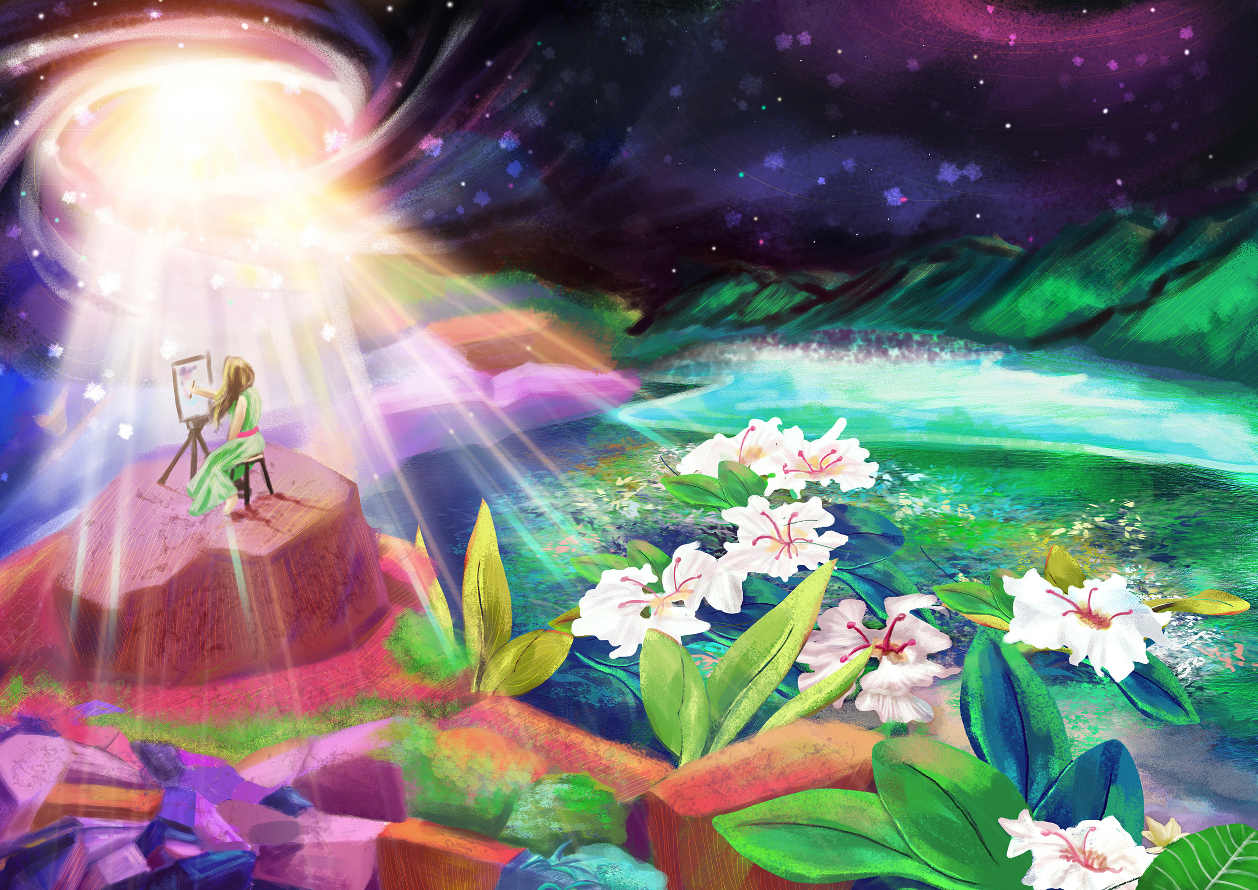 画画的人,无论身在何方,在绘画的过程中,好像超越了时间空间,就像黑暗中打下一束名为缪斯的光,行云流水,步步生莲。 No matter where the painter is, in the process of painting, he seems to go beyond time and space, just like laying a beam of light called Muse in the dark, flowing clouds and water, growing lotus step by step