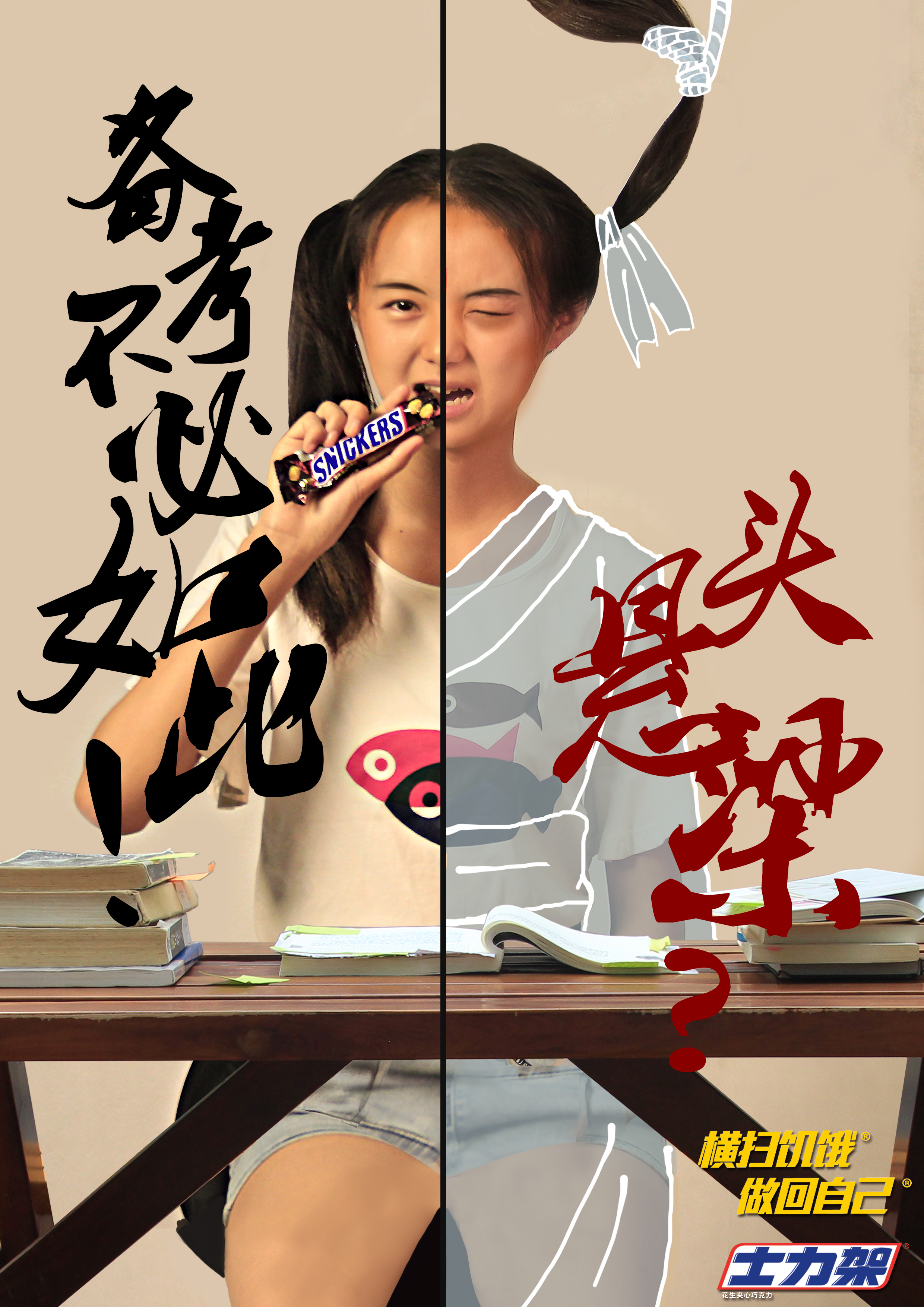 平面的右半部女生的头发绑着绳子,被向上拉起——“头悬梁”,女生的面部表情扭曲痛苦 左半部分则是女生悠然自得吃着士力架,表情愉悦 前景是放着书本联系的书桌,体现出女生正在读书,通过文案“锥刺股?备考不必如此!”的配合,表现出女生正在寻求让自己在备考时提神醒脑的方法,锥刺股的痛苦和吃士力架的愉悦轻松产生视觉感官的对比。