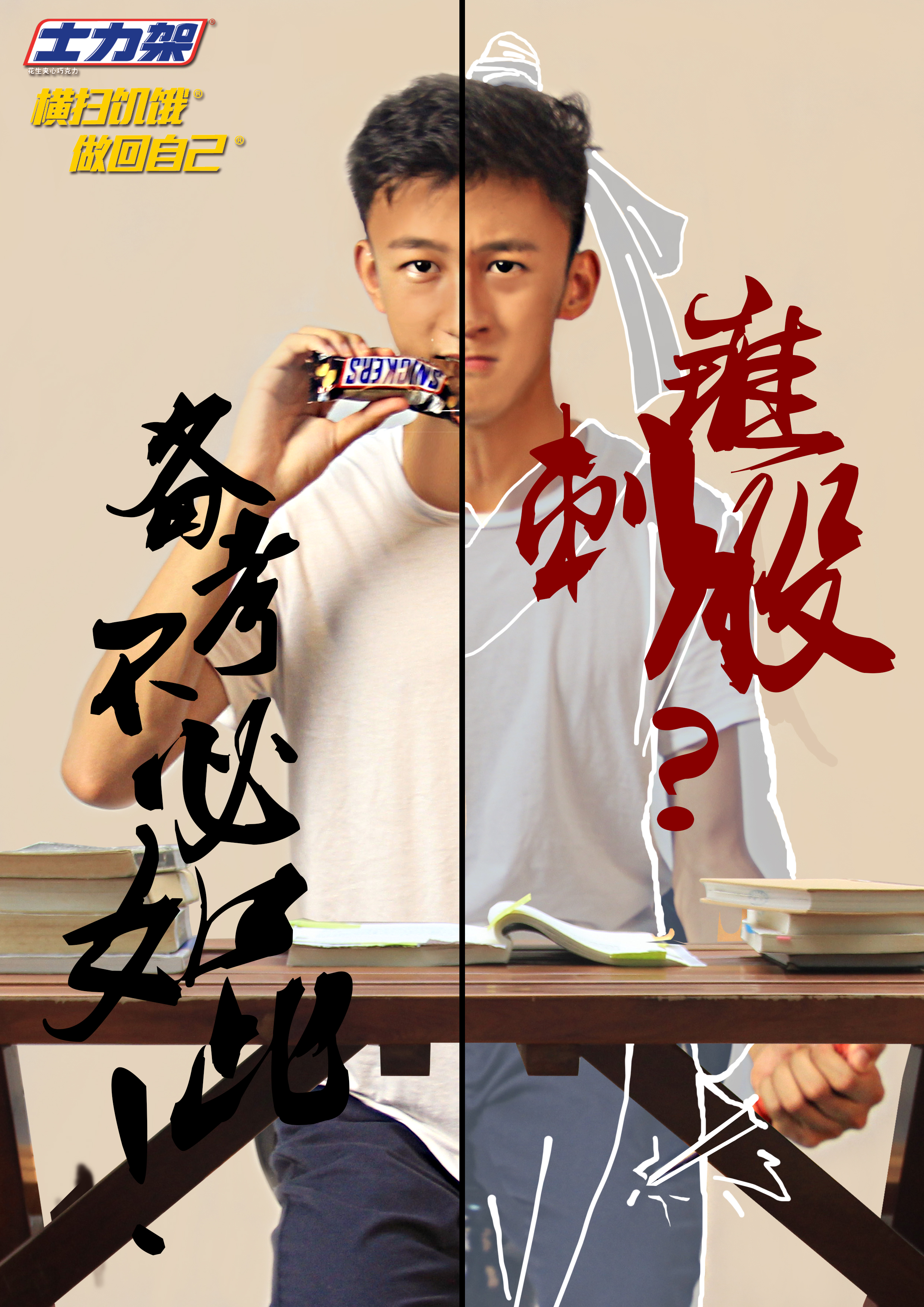 平面的右半部男生手握锥子刺向大腿——“锥刺股”,男生的面部表情扭曲痛苦 左半部分则是男生悠然自得吃着士力架,表情愉悦 前景是放着书本联系的书桌,体现出男生正在读书,通过文案“锥刺股?备考不必如此!”的配合,表现出男生正在寻求让自己在备考时提神醒脑的方法,锥刺股的痛苦和吃士力架的愉悦轻松产生视觉感官的对比。